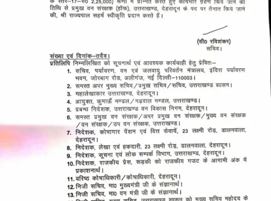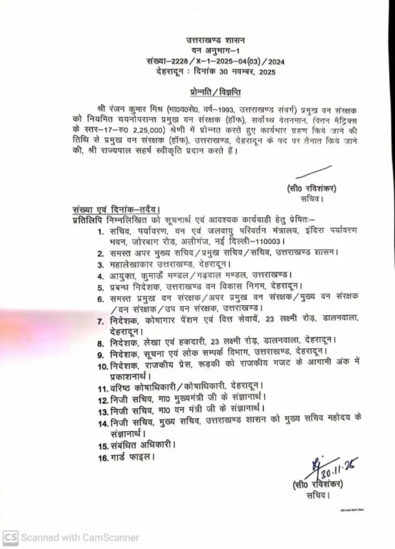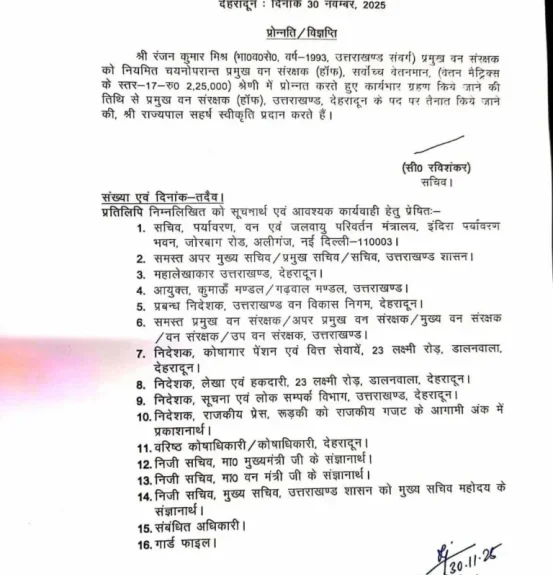 श्री रंजन कुमार मिश्र (भा०व० से०, वर्ष 1993, उत्तराखण्ड संवर्ग) प्रमुख वन संरक्षक को नियमित चयनोपरान्त प्रमुख...