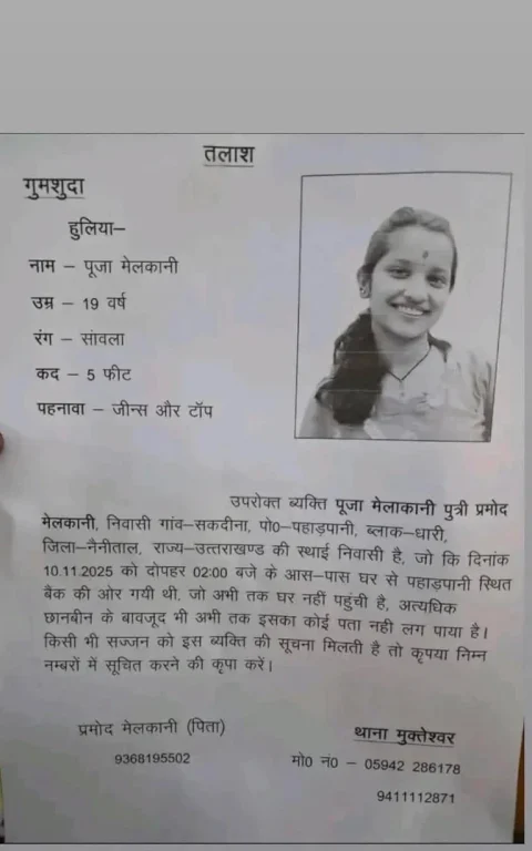 भीमताल: पूजा मेलाकानी पुत्री प्रमोद मेलकानी, निवासी गांव-सकदीना, पो०-पहाड़पानी, ब्लाक-धारी, जिला-नैनीताल, राज्य-उत्तराखण्ड की स्थाई निवासी है, जो कि दिनांक 10.11.2025 को दोपहर 02:00 बजे के आस-पास घर से पहाड़पानी स्थित बैंक की ओर गयी थी. जो अभी तक घर नहीं पहुंची है, अत्यधिक छानबीन के बावजूद भी अभी तक इसका कोई पता नही लग पाया है। किसी भी सज्जन को इस ब्यक्ति की सूचना मिलती है तो कृपया निम्न नम्बरों में सूचित करने की कृपा करें।