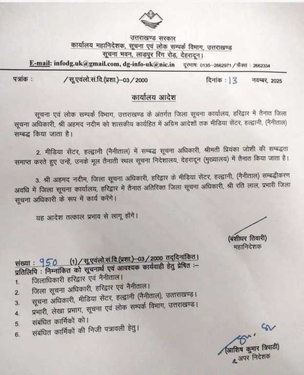 आदेश में यह भी उल्लेख है कि अहमद नदीम के मीडिया सेंटर हल्द्वानी सम्बद्धीकरण की अवधि में जिला सूचना कार्यालय हरिद्वार में तैनात अतिरिक्त जिला सूचना अधिकारी श्री रति लाल प्रभारी जिला सूचना अधिकारी के रूप में कार्य करेंगे।