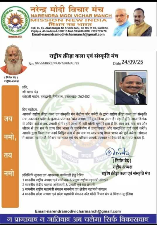 हल्द्वानी के सागर चंद को देहरादून में आयोजित अंतरराष्ट्रीय शिक्षक दिवस कार्यक्रम पर हुए सम्मानित नव विहान ट्रस्ट, सामाजिक सांस्कृतिक संगठन तथा मिशन न्यू इंडिया के संयुक्त तत्वधान में अंतर्राष्ट्रीय शिक्षक दिवस के अवसर पर चाणक्य सम्मान से समग्र शिक्षा अभियान के अंतर्गत सेवा देने वाले शिक्षको को सम्मानित, किया गया l प्रदेश की राजधानी देहरादून में होटल सिटी स्टार में बहुत बड़ी संख्या में उन्नत शिक्षाविद् समाज सेवियों को सम्मानित किया गया राष्ट्रीय अध्यक्ष माननीया डा ज्योति श्रीवास्तव ने बताया कि प्रत्येक वर्ष विश्व शिक्षक दिवस पर यह कार्यक्रम किया जाता है इस कार्यक्रम में नरेंद्र मोदी विचार मंच व मिशन न्यू इंडिया के राष्ट्रीय पदाधिकारियो ने भी शिक्षकों को सम्मानित किया l विशेष रूप से इस कार्यक्रम में हल्द्वानी के सागर चंद को राष्ट्रीय क्रीड़ा कला एवं संस्कृति मंच उत्तराखंड प्रदेश के कुमाऊ प्रांत का प्रांत अध्यक्ष नियुक्त किया गया और उन्हें प्रमुख राष्ट्रीय महासचिव संगठन दिलीप कुमार सिंह, राष्ट्रीय अध्यक्ष उद्योग एवं व्यापार मंच माननीय डा उमेश पटेल जी राष्ट्रीय अध्यक्ष शिक्षक मंच अनिरुद्ध मिश्रा जी राष्ट्रीय महिला शाखा अध्यक्ष डा ज्योति श्रीवास्तव राष्ट्रीय अध्यक्ष खेल एव कला संस्कृति मंच निर्मल वैद जी व उत्तर प्रदेश अध्यक्ष ब्रजेश मिश्रा जी द्वारा सम्मनित किया गया व नियुक्ति पत्र दिया गया